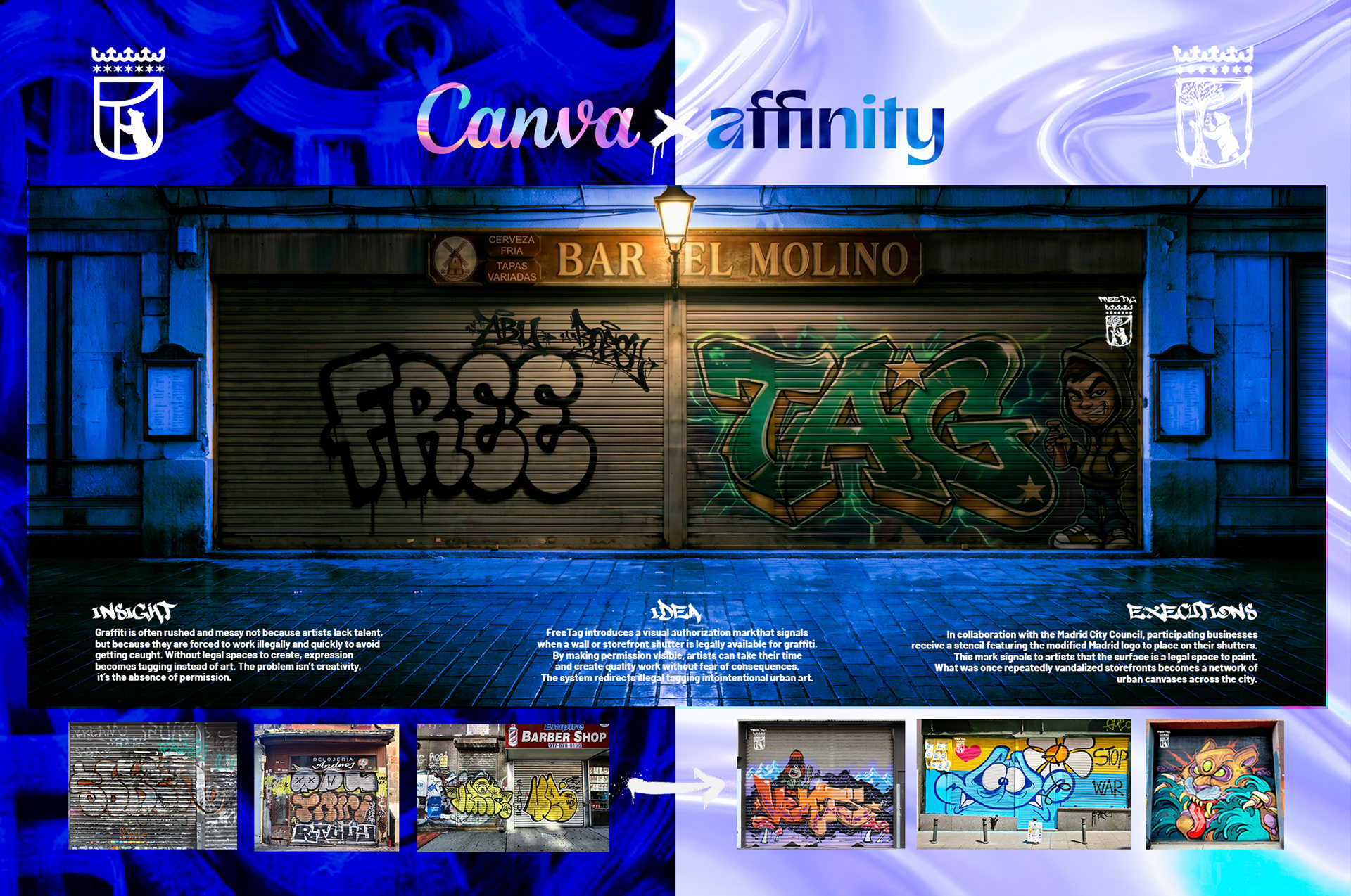 FreeTag: Designing Legal Canvases for Urban Art Graffiti is often rushed and messy because artists are forced to work illegally to avoid being caught. The problem is not a lack of creativity, but the absence of permission, which turns potential art into hurried tagging. FreeTag introduces a visual authorization mark, a modified Madrid City Council logo, that signals a storefront shutter is legally available for graffiti. By making permission visible, artists can take their time to create high-quality, intentional work without the fear of legal consequences. In collaboration with the city, participating businesses use this stencil to transform vandalized storefronts into a network of professional urban canvases. This system effectively redirects illegal tagging into impactful art that enhances the community.